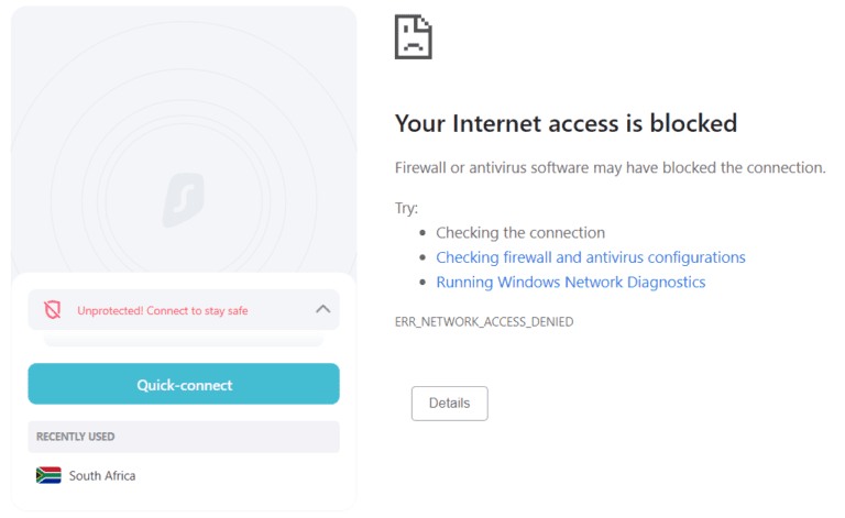 - 接下來,我斷開與 VPN 服務器的連接,並嘗試再次訪問 Surfshark 網站。這次我遇到了一條彈出消息:“您的互聯網訪問被阻止”。