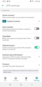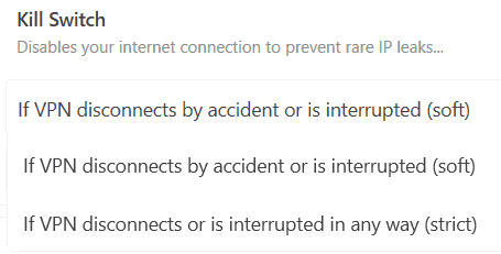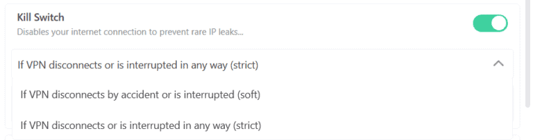 從本質上講,嚴格選項的功能與其他所有終止開關一樣,一旦出現任何中斷就會立即斷開您的互聯網連接。這 ”柔軟的” 設置僅在 VPN 服務被意外禁用時斷開您與網絡的連接。
