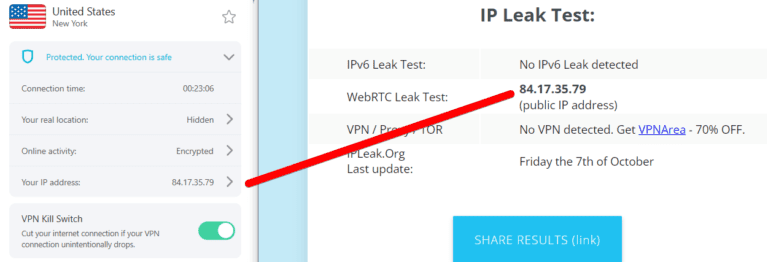 為了了解 VPN 服務的有效性,我連接到美國紐約服務器並測試了 DNS、WebRTC 和 IP 洩漏。