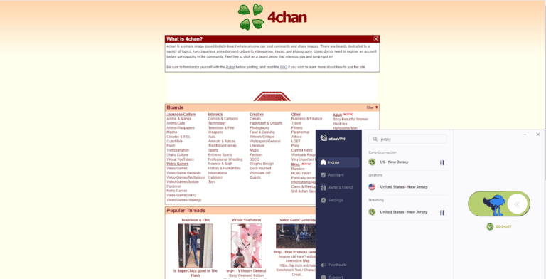 測試服務器的解鎖能力,我訪問了4chan在新澤西學院,它被封鎖了,並且享受不受限制的瀏覽。