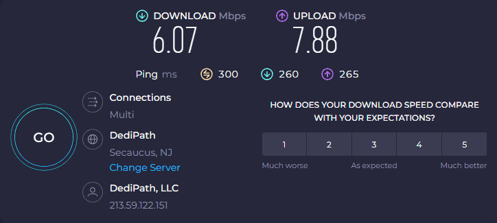 也就是說,當我在我的電腦上測試 PureVPN 速度時20 Mbps 連接,我測量了6.07 兆比特/秒。但我的同事們運氣更好。