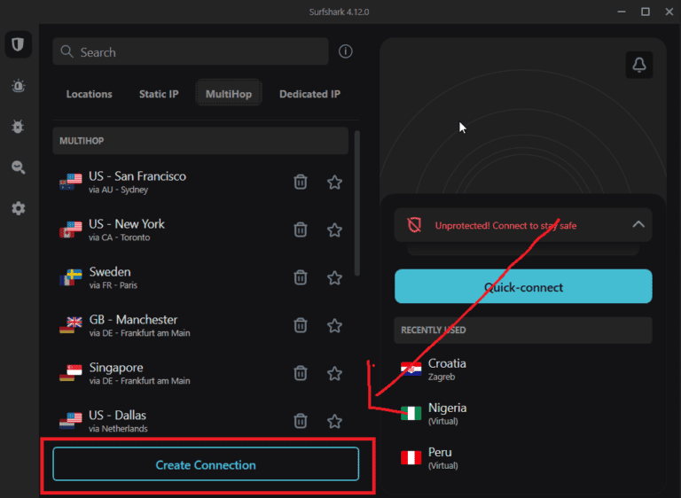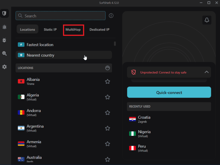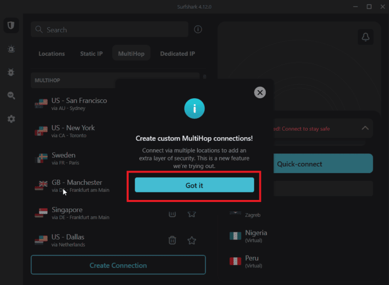 您還可以連接到 Surfshark 的 MultiHop 服務器以改善比利時的隱私。這為您提供了連接入口點和出口點的不同 IP 地址。因此,任何跟踪您的人只能看到您連接的第一個 IP,而看不到第二個。