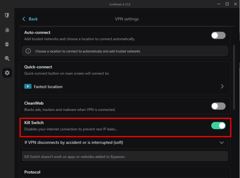 - 激活 Surfshark 終止開關以確保您的 VPN 連接始終受到保護。要激活,請轉至設定>VPN 設置>終止開關。