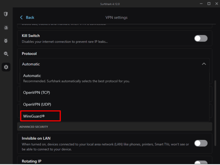 - 選擇合適的 Surfshark 協議。我推薦 WireGuard 協議,因為它的速度、安全性和穩定性。要連接,請轉至設定>VPN 設置>協定>線衛。