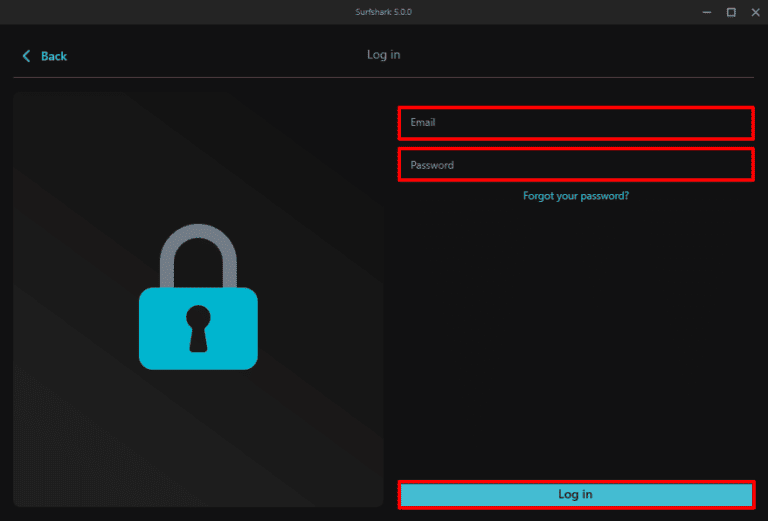 - 使用您的電子郵件地址和密碼登錄 Surfshark Windows 應用程序。