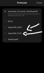- 選擇一個列表中的 OpenVPN(UDP 或 TCP)協議,這將自動啟用偽裝模式。我建議使用 UDP 以獲得更好的速度。然後點擊“關閉”。