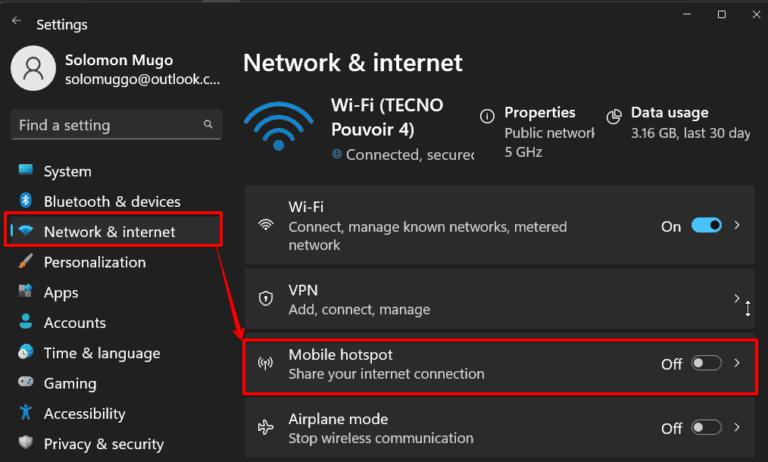 - 前往設置 > 網絡和 Internet > 移動熱點在您的電腦上。