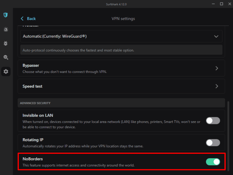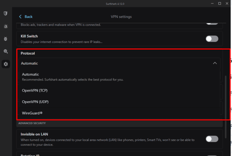 - 連接到適當的 Surfshark 協議。考慮WireGuard 協議因其速度與安全性的出色平衡。要連接到 WireGuard,請訪問設置 > VPN 設置 > 協議 > WireGuard。