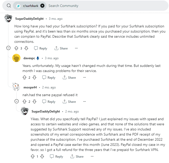 如果您使用 PayPal 付款,Surfshark 將全額退款,前提是您取消30天內購買。或者,您可以使用PayPal爭議解決中心到付款後 180 天內要求退款。