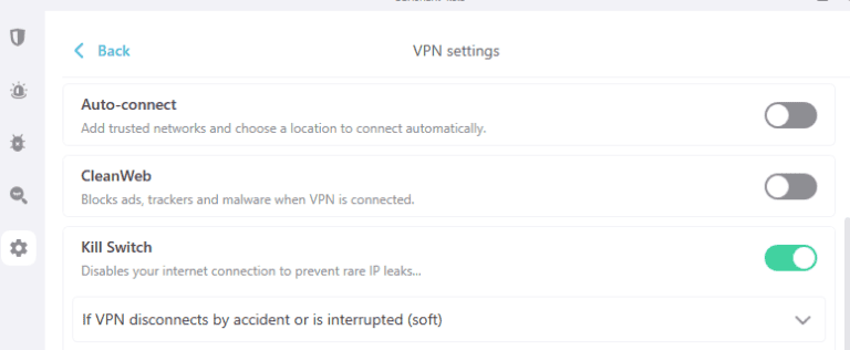 在 Surfshark 應用程序上啟用終止開關,以避免 VPN 連接隨機斷開時潛在的洩漏。