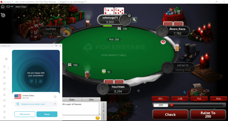 Surfshark 提供一系列先進的安全功能,讓您安全的和匿名的在玩撲克之星時。 Surfshark 安全功能包括軍用級AES 256 位加密,一個專門的終止開關, 和智慧財產和DNS 洩漏保護。