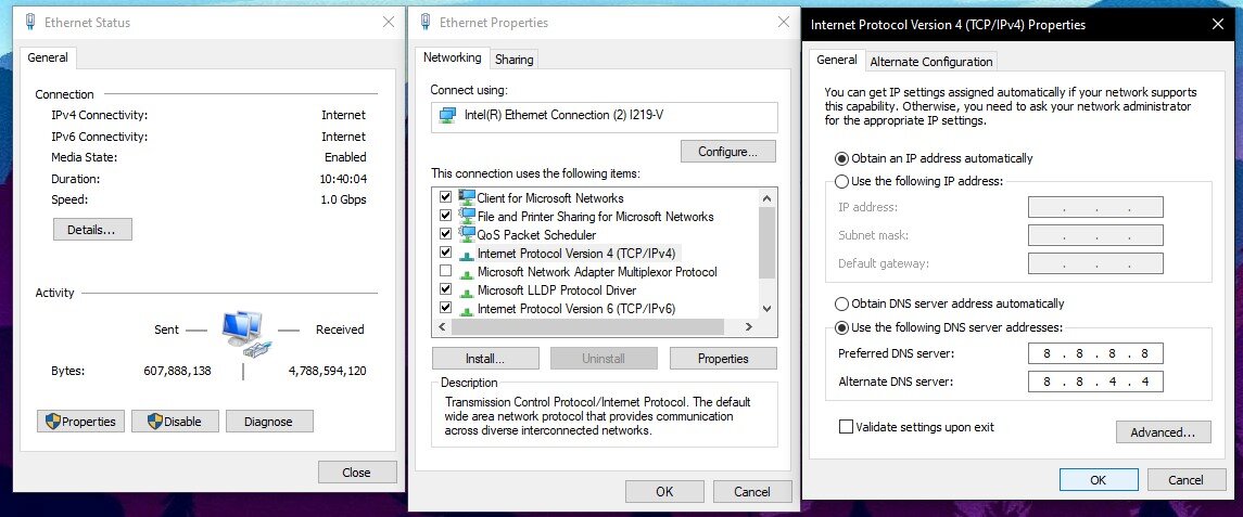 這將打開您的控制中心。從那裡導航到網絡與互聯網、網絡與共享中心,然後在此處選擇您的連接。導航至特性最後,雙擊互聯網協議版本 4您可以在下面的屏幕截圖中預覽。選擇到使用以下 DNS 服務器地址選項,並作為您的首選 DNS 服務器,使用:8.8.8.8當您備用 DNS 服務器時,請使用:8.8.4.4。這些是 Google 的官方公共 DNS 服務器地址,可以安全使用。