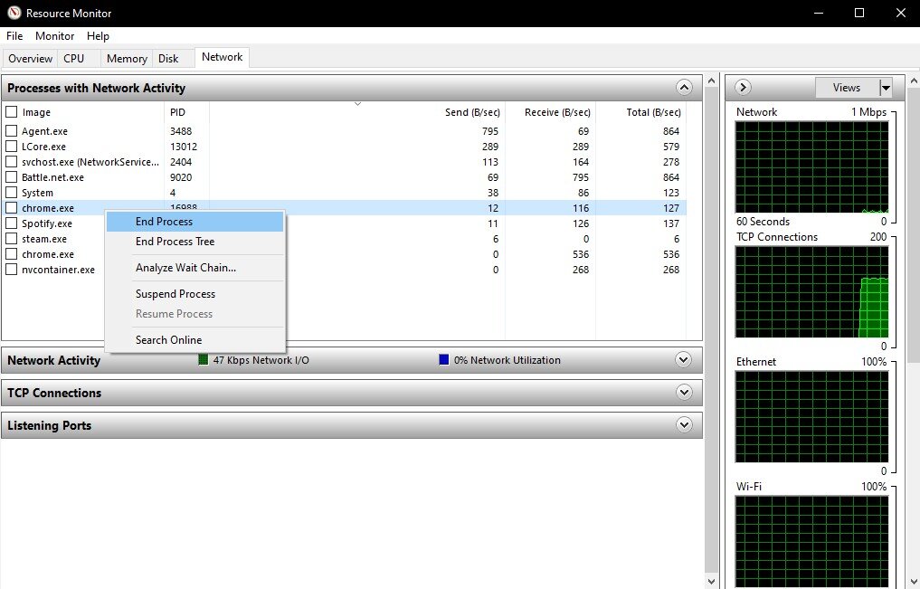 幾秒鐘後,您將看到系統上使用網絡連接的每個進程。這可能是您的瀏覽器在後台運行、steam 或下載造成您的連接瓶頸。我建議您只結束您知道不會破壞操作系統的進程。在下面的選項卡中,您還可以預覽網絡利用率百分比。