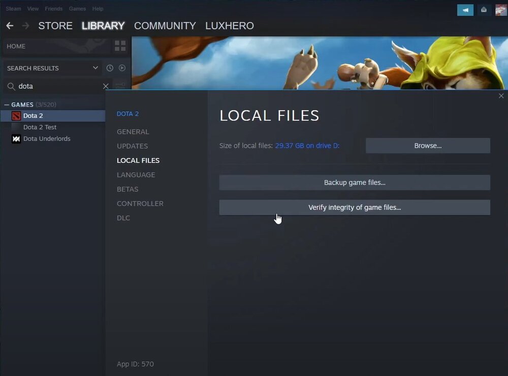 Steam 庫 > Dota 2 > 屬性 > 本地文件