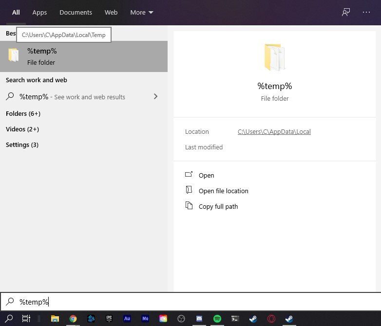 如果您在加載地圖或下載其他內容時遇到問題,請確保刪除臨時文件。搜尋%溫度%在任務欄中搜索以打開臨時文件夾。您可以安全地刪除文件夾中的所有內容,某些文件可能會保留,因此只需將它們留在那裡即可。這可以幫助您減少硬盤驅動器上的混亂情況。