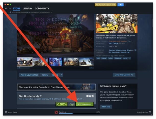 - 找到顯示“獲取無主之地 2”的位置,然後選擇“添加到帳戶”(6 月 8 日前免費)