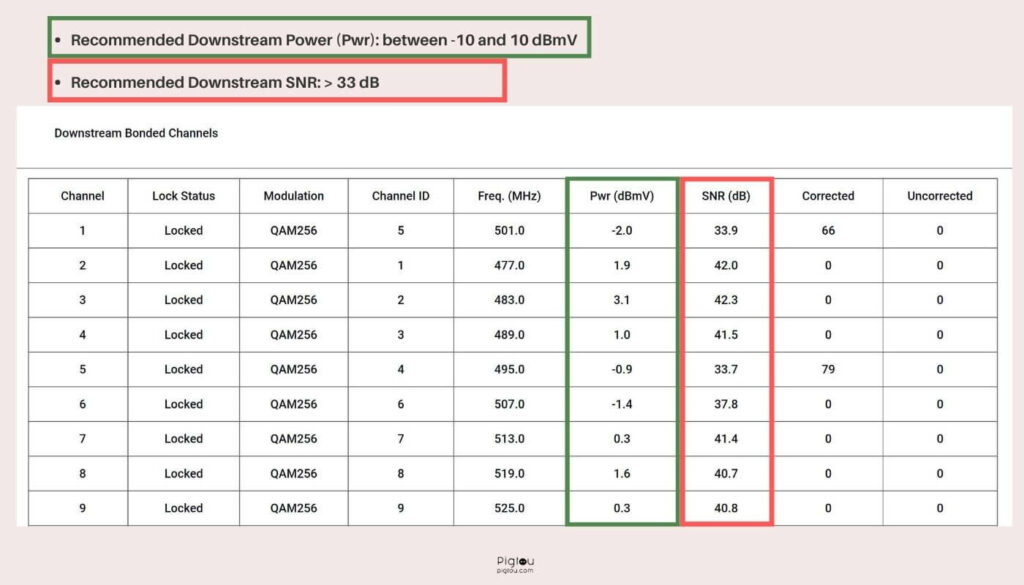 您應該看到兩個表:下游和上游。您必須確保每個通道都在這些建議值範圍內: