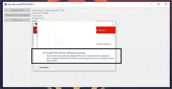 步驟 6. 再次打開安裝文件,然後單擊“Bypass FRP”。等待該過程完成,如果出現驅動程序安裝彈出窗口,請單擊“仍然安裝此驅動程序軟件”。