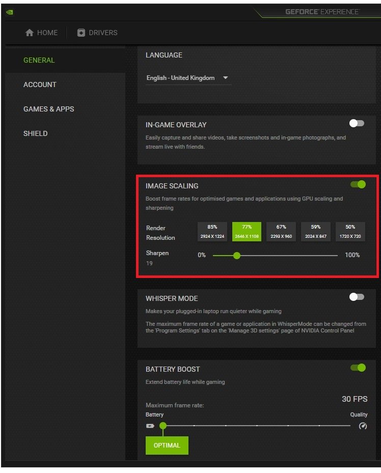 如果問題與系統性能有關,您可能需要降低遊戲內圖形設置。如果您使用的是英偉達顯卡,我建議啟用NVIDIA Image Scaling,這將大大提高你的性能。為此,您應該使用GeForce 體驗應用。在“驅動程序”選項卡中,確保安裝了最新的 GPU 驅動程序。導航至您的 GeForce 設置。向下滾動並啟用圖像縮放選項。這將提高您在電腦上玩遊戲時的整體幀速率。