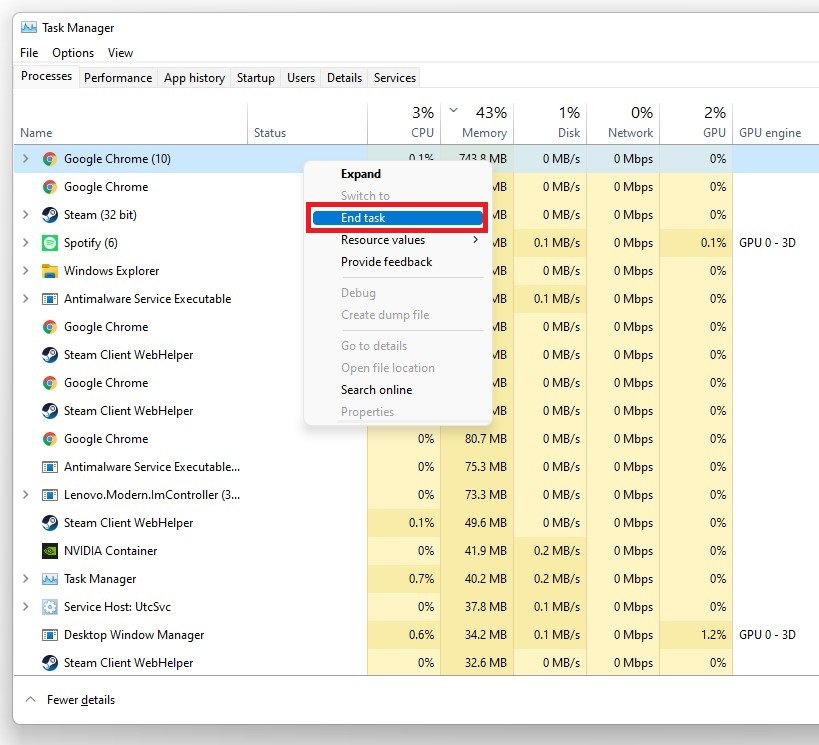 如果問題仍然存在,請打開您的工作管理員通過在開始菜單搜索中搜索它。在流程選項卡,確保結束程序在後台運行,這可能會在遊戲中顯示覆蓋圖。就我而言,那就是蒸汽,GeForce 體驗,或者不和諧。此外,您還應該結束 CPU 密集型進程,例如 Shadowplay 和 Adobe 應用程序,但確保僅結束您知道不會破壞操作系統的進程。