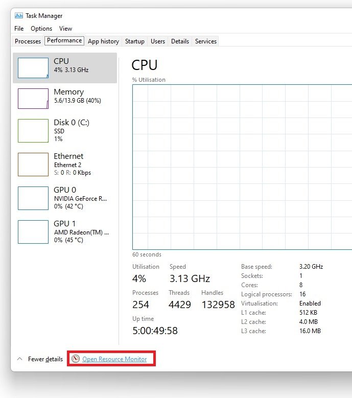 打開你的工作管理員通過在開始菜單搜索中搜索它。在表現選項卡,單擊打開資源監視器。