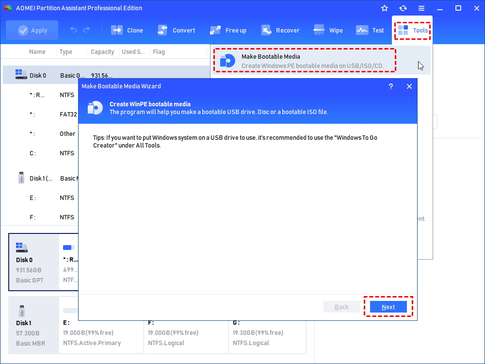 步驟1。在另一台 Windows 11 電腦上,安裝並運行此免費磁盤工具。插入 USB 驅動器至少 13GB容量。一旦您的電腦檢測到 USB,請單擊“工具” > “製作可啟動媒體”,然後單擊頂部面板中的“下一個” 繼續。