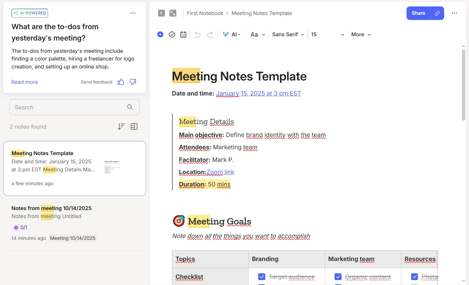 它是為那些喜歡整潔且易於查找的人而設計的。它使用筆記本、堆棧和標籤這樣您就可以將所有東西放在它所屬的地方。該搜索工具非常強大——它可以在文本、PDF 甚至圖像中查找單詞。還有新的人工智能搜索讓它變得更加智能:你可以輸入一個問題,比如“上週五的會議記錄”,它會立即調出它們。