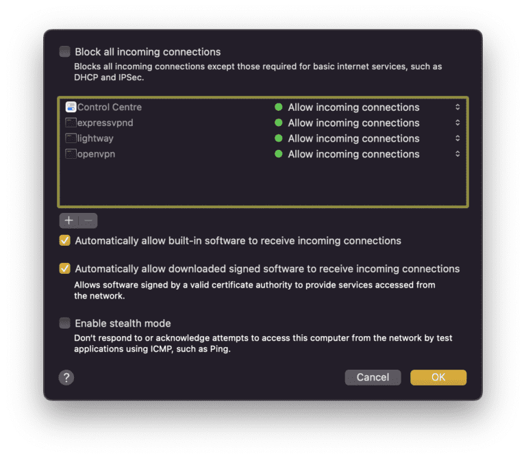 您還可以添加 ExpressVPN 的例外到您的防火牆或安全軟件來處理 ExpressVPN 應用程序卡在連接上的情況。