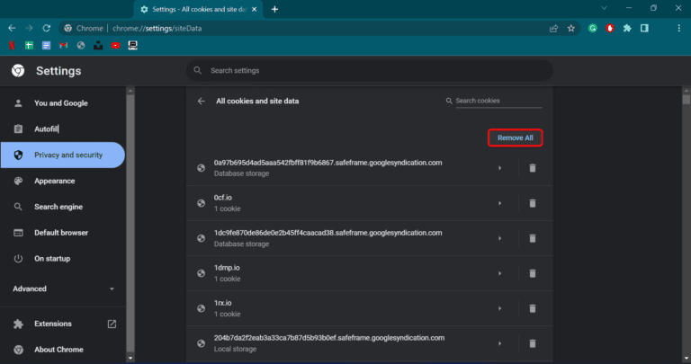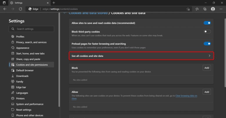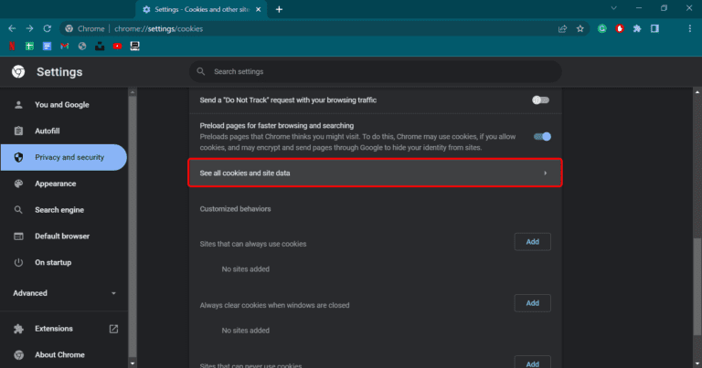 - 點擊左側選項卡中的隱私和安全,然後選擇“Cookie 和其他網站數據。“