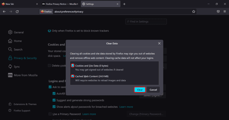 - 確保“Cookie 和網站數據”和“緩存的網頁內容”在彈出窗口中選中復選框。輕敲“清除。“