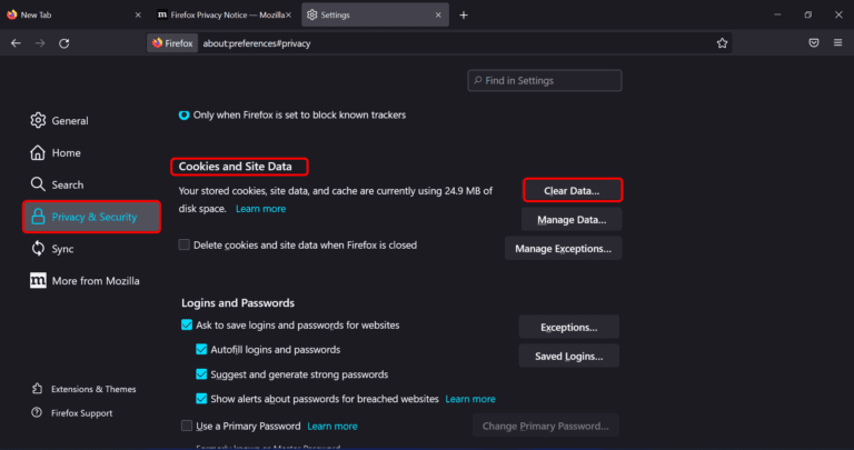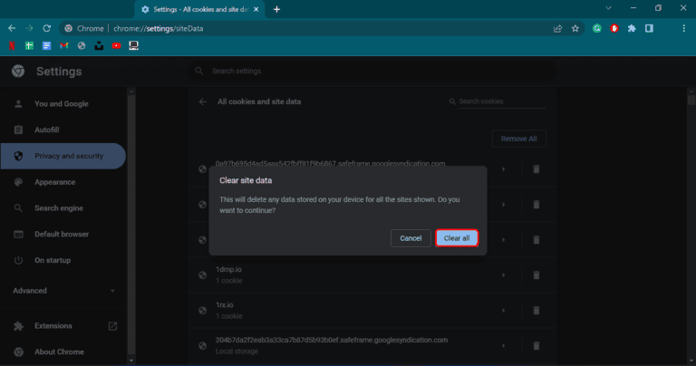 - 點擊“隱私與安全”從左側選項卡中選擇“Cookie 和網站數據。“然後點擊“清晰的數據。“