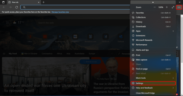 - 打開 Microsoft Edge,單擊屏幕右上角的三個點,然後選擇"設定。“