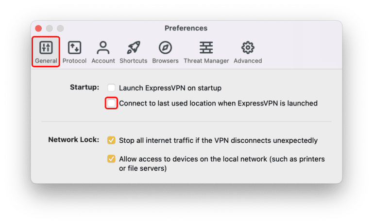 - 向下滾動到“一般的”部分並切換“ExpressVPN 啟動時連接到上次使用的位置”設置為“離開。”