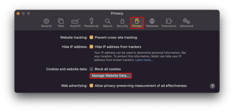 - 在“首選項”窗口中,單擊“隱私”選項卡。然後點擊“管理網站數據”在Cookie 和網站數據部分。