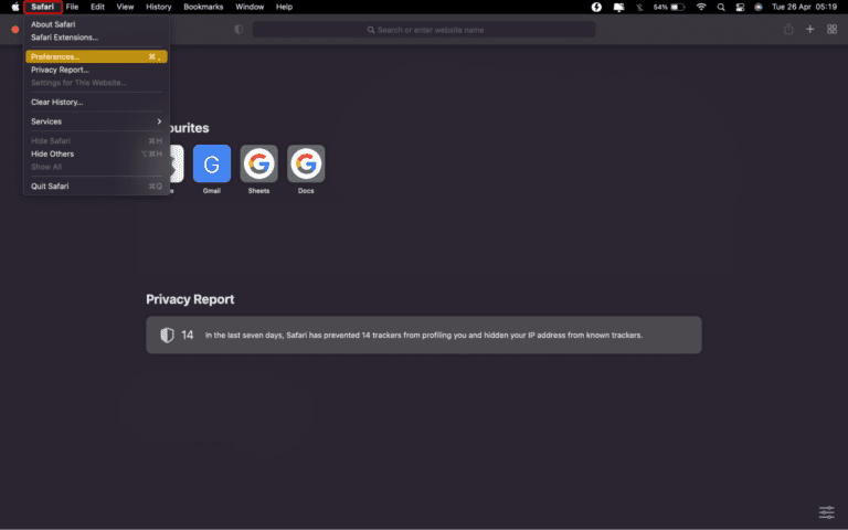 - 打開 Safari,然後單擊屏幕頂部菜單欄中的 Safari。選擇 ”偏好設置。”