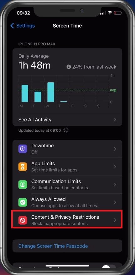 如果問題仍然存在,某些限製或家庭共享可能會阻止您更改設置,甚至無法登錄其他 Apple ID 帳戶。要解決此問題,請返回主設置並點擊屏幕時間。確保完全禁用內容和隱私限制。