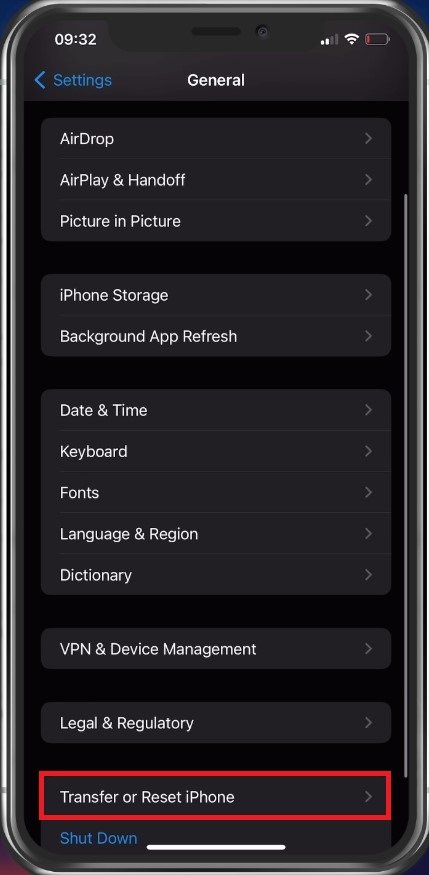 作為最後的手段,您可以重置 iPhone 設置,以確保此問題與您當前的設備設置無關。在你的一般的iPhone 設置,向下滾動並點擊轉移或重置 iPhone。