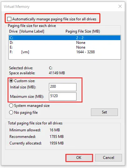 6. 現在,選中旁邊的框自動管理所有驅動器的分頁文件大小並單擊“確定”按鈕。
