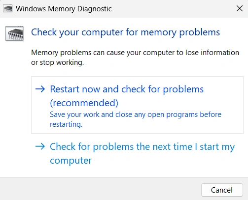 筆記 :您可以通過按 Win + R 啟動此工具,輸入mdsched.exe,並單擊“確定”按鈕。