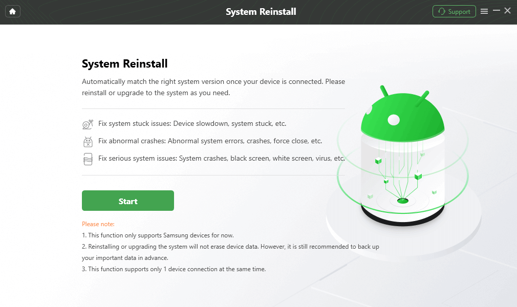 步驟 1. 此外,啟動 DroidKit 並前往系統重裝控制板。您只需點擊一下即可重新安裝或升級 AndroidOS。