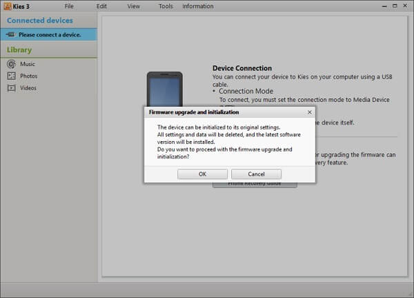 步驟 4:Kies 將通知您固件升級和初始化過程將清除您的所有數據和設置,然後您的手機將更新到當前固件版本。要繼續,請單擊“確定”。