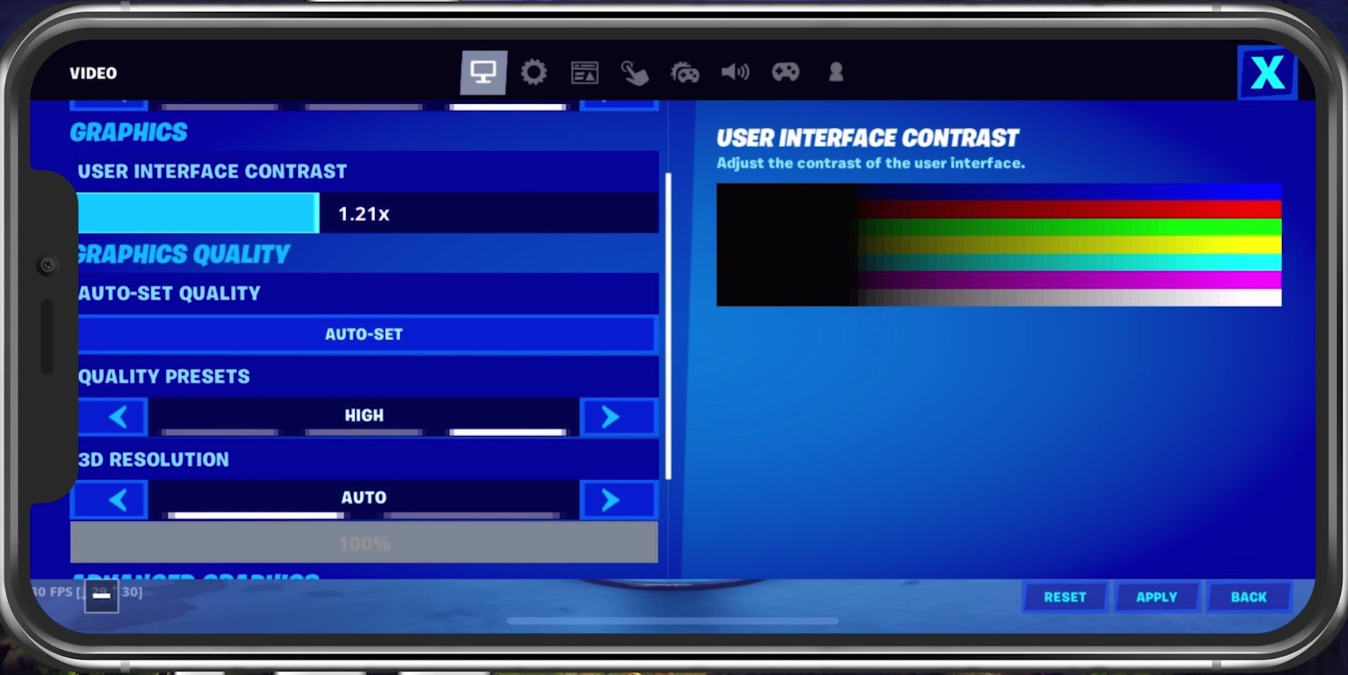 打開 Fortnite 並導航到您的影片設置選項卡,這將極大地影響遊戲的性能和質量。我將為中低端設備設置這些,因為它還會減少游戲產生的干擾,並幫助您在您想要使用的任何移動設備上順利運行《堡壘之夜》移動版。
