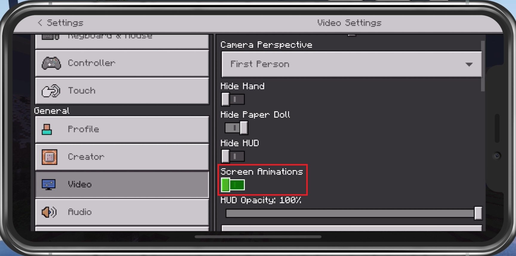 在影片部分,將其中大部分設置為您的偏好,因為它們對設備性能的影響最小。這包括您的亮度,此選項設置得越高,只會耗盡電池電量。你的相機視角,隱藏手,紙娃娃,和平視顯示器最好保留默認設置。為了獲得最大的性能,特別是在大世界或下界,考慮禁用屏幕動畫。