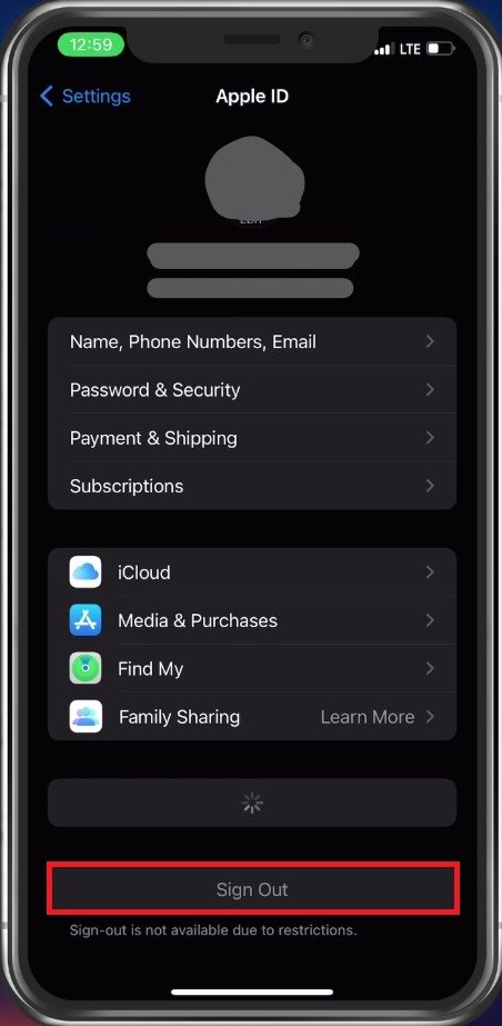 打開您的設置應用程序。在這裡,點擊您的 Apple ID 並選擇註銷,幾秒鐘後,繼續重新登錄您的帳戶。這將確保正確蘋果ID可以聯繫您,並且您有權在您的設備上更改您的 Apple ID 設置。