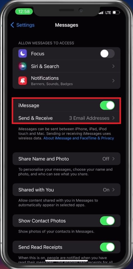 在大多數情況下,此問題是由阻止您通過 iMessage 或 FaceTime 聯繫的選項引起的。打開你的 iPhone 設置。在這裡,向下滾動並點擊留言。確保簡訊選項已啟用。激活此選項可能需要幾秒鐘的時間。