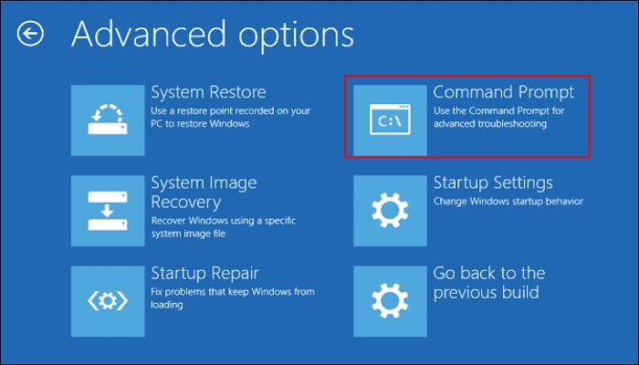 步驟2– 單擊“疑難解答”、“高級選項”、“命令提示符”。
