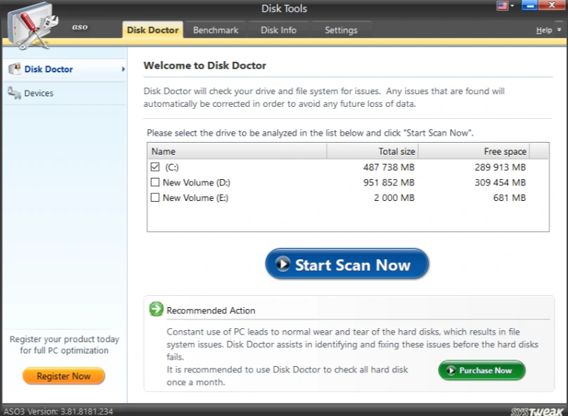 高級系統優化器是完整的電腦優化工具,可幫助用戶維護和優化他們的計算機。它由多個模塊組成,允許用戶執行特定的維護任務。應用程序中的此類模塊之一是“磁盤醫生”,它將掃描您的硬盤是否有壞扇區和其他問題。它還嘗試修復這些問題,這將解決修復電腦上的磁盤錯誤。