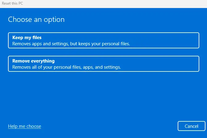 筆記 :如果您的電腦上沒有數據,那麼我們建議您選擇“刪除所有內容”。但如果有有價值的數據,則首先嘗試使用“保留我的文件”選項,如果問題沒有解決,則選擇“刪除所有內容”。