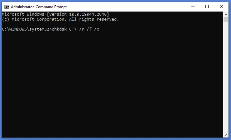 步驟3:命令提示符打開後,複製並粘貼以下命令,然後按 Enter 鍵。chkdsk C: /r /f /x