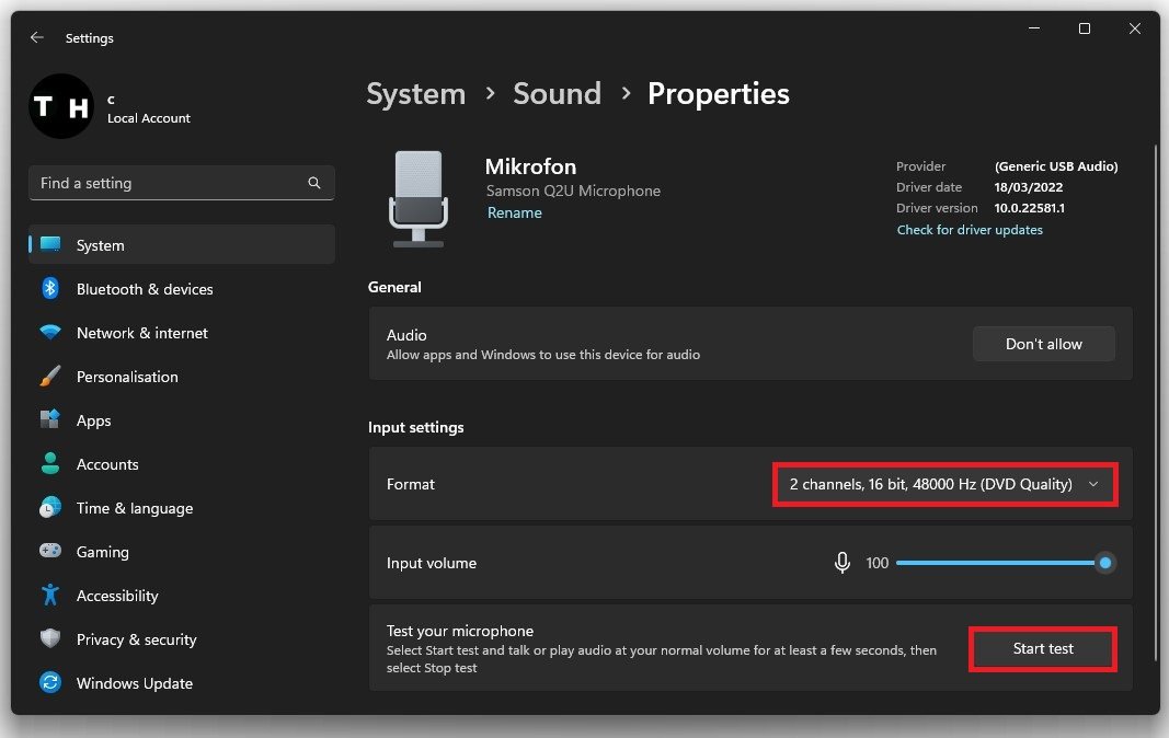選擇您要使用的麥克風並設置其格式到2 個頻道 48'000赫茲或44'100Hz,以您可用的為準。